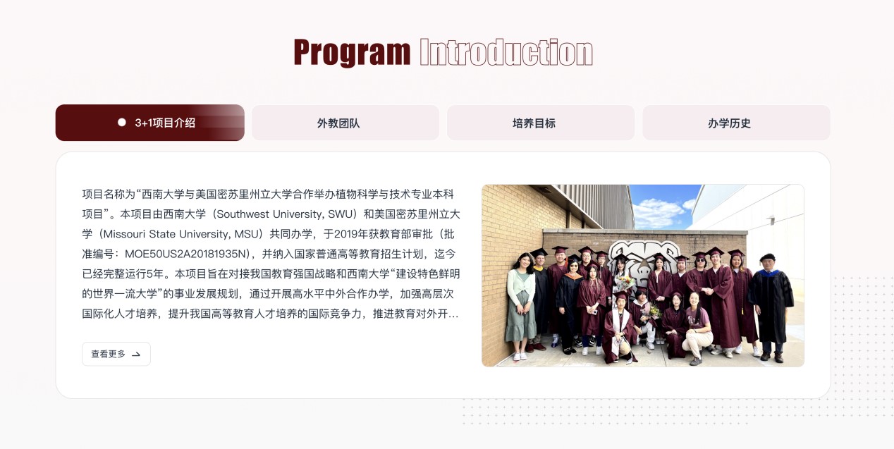 本专业采用“3+1”“双学位”培养模式,即前三年在西南大学(SWU)学习,由中美双方教师共同授课,第四年在美国密苏里州立大学(MSU)学习,由美方教师授课,达到相关要求者获得西南大学颁发的植物科学与技术专业普通高等教育本科毕业证书与农学学士学位证书,以及美国密苏里州立大学颁发的理学学士学位证书;“4+0”培养模式,即在西南大学学习4年,由中美双方教师共同授课,达到相关要求者可获得西南大学颁发的植物科学与技术专业普通高等教育本科毕业证书与农学学士学位证书。