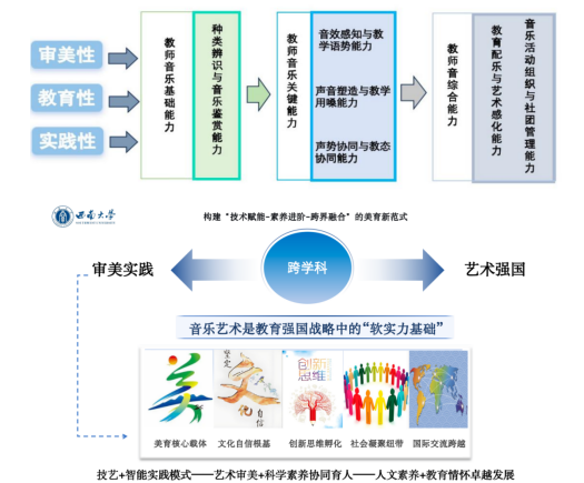 我提出 “艺术审美性·教育教学性·实践应用性”三位一体的教学原则,构建了“技术赋能—素养进阶—跨界融合”以学生为中心的美育新范式: