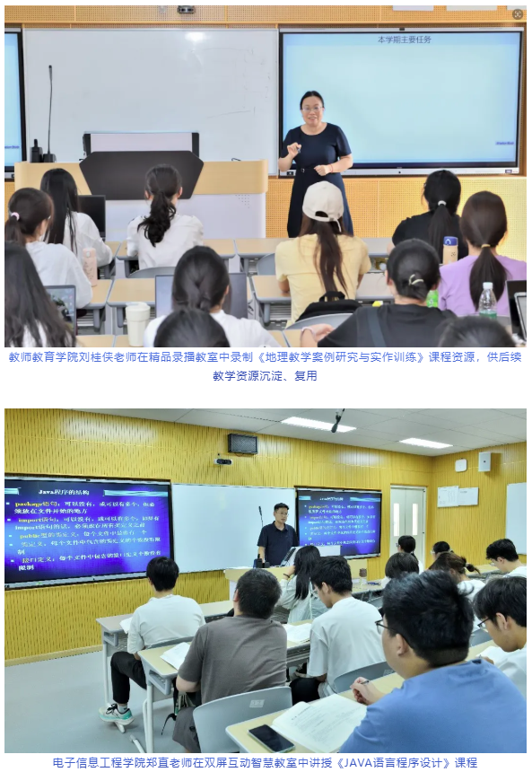 学校多措并举将各类型新形态课程安排至智慧教室中开展教学。首先,为进一步加强AI赋能课程教学应用示范,打造学校智慧教学的范式推广,学校将AI教学创新大赛获奖教师的课程安排至智慧教室中,并将课程录制成视频资源,供后期推广。第二,各开课单位将一流课程等各类优质课程安排至智慧教室,进一步优化教学方法,打磨优质资源。第三,赋能公共外语、思政课程教学改革,开展公共课同步课程、智慧教学等新形态教学活动,以学生发展为中心,丰富课堂教学方式,进一步提升课堂教学效能。目前已有通识必修课、通识选修课、学科必修课、专业必修课、专业选修课、国际课程等各类型课程安排至31教智慧教室授课,共计508个教学班次。后续,长师云班微专业课程也将在31教进行。