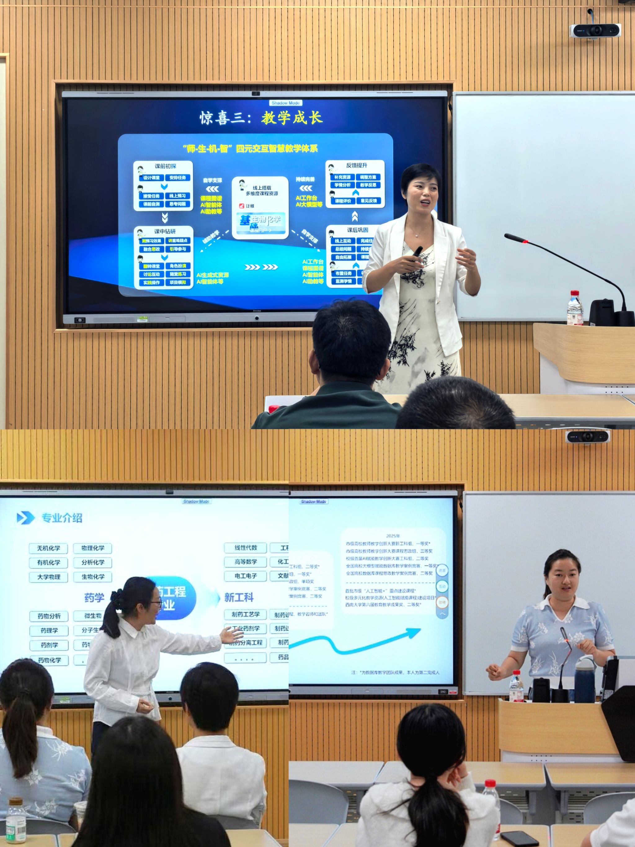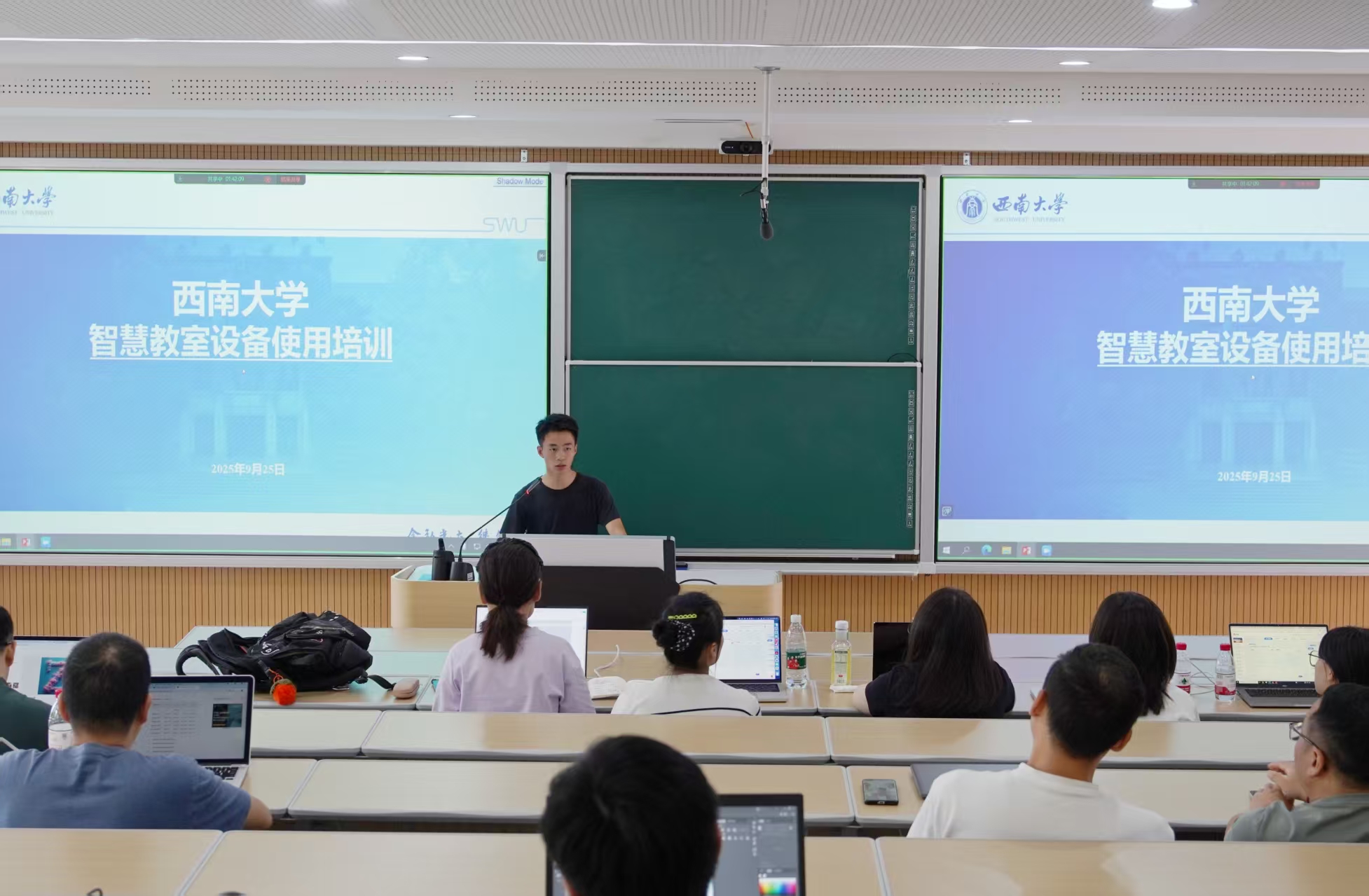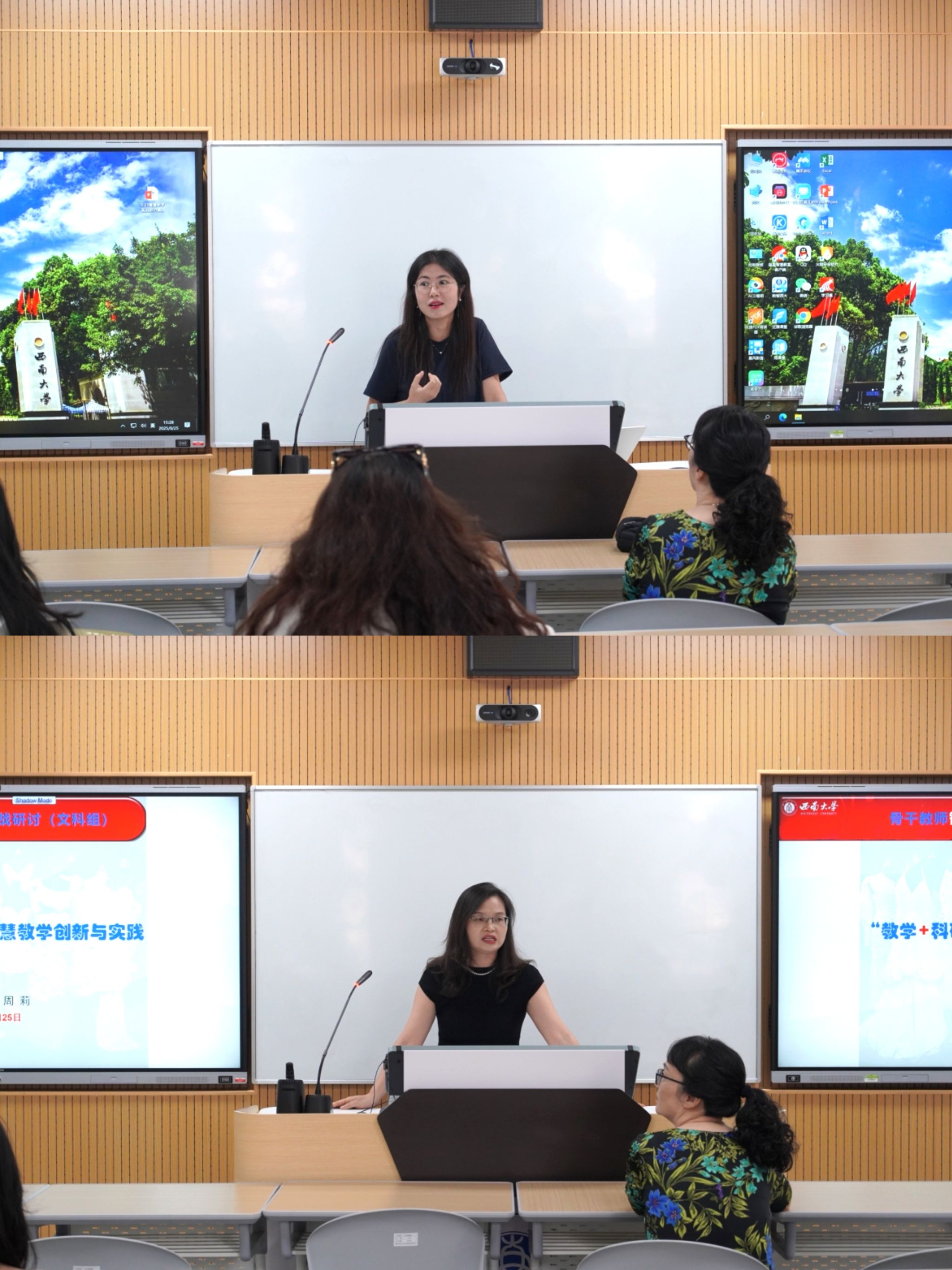 9月25日,西南大学在智慧教学楼举办2025年青年教师教学能力提升培训第二期暨骨干教师沙龙第一期。培训邀请超星泛雅集团数字化教育培训师杨芬、学校智慧教室项目负责人周海洋主讲;骨干教师沙龙分文科组、理科组同步开展,分别由蚕桑纺织与生物质科学学院周莉教授、法学院李丹副教授,以及农学与生物科技学院梅家琴教授、计算机与信息科学学院 软件学院胡莎老师、药学院 中医药学院郭婷老师担任分享嘉宾,近百名教师现场参与。