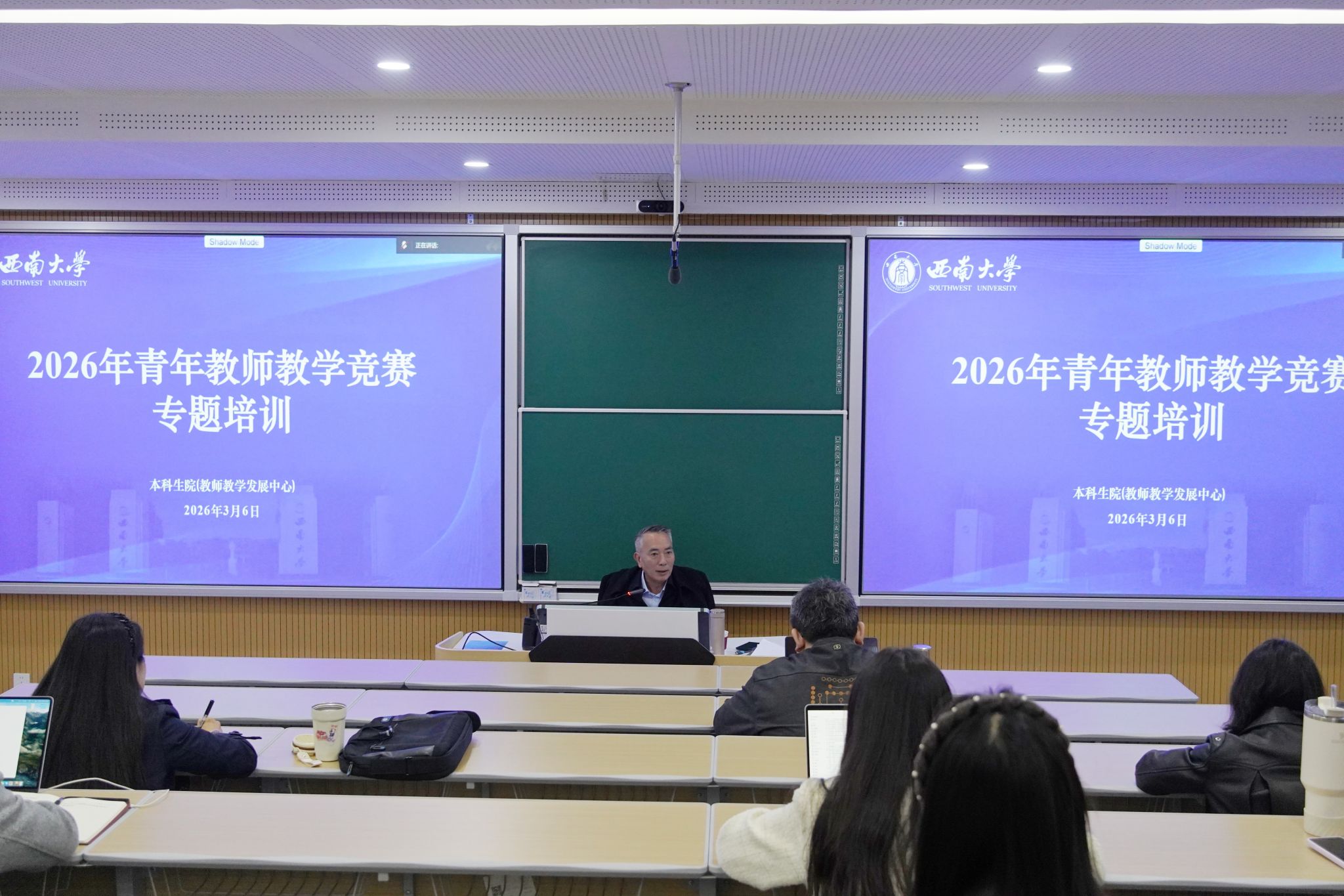 为提升青年教师专业素养,助力教师备战第八届重庆市高校青年教师教学竞赛,3月6日,学校在31教智慧教学楼举办2026年青年教师教学竞赛专题培训。培训邀请西南政法大学龙大轩教授、山东师范大学张慧伦教授担任主讲嘉宾,50余名青年教师线上线下同步参训。