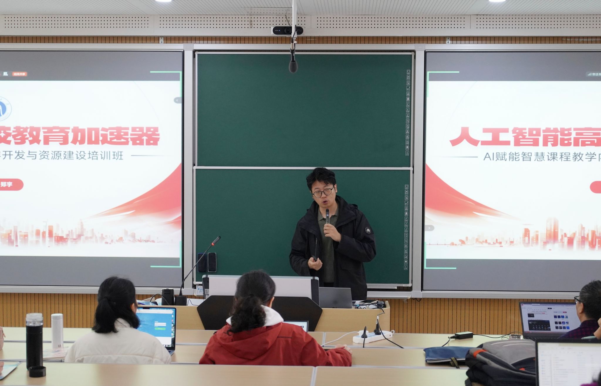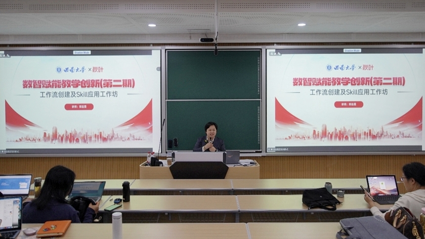 3月26日至27日,学校于31教智慧教学楼举办“数智赋能教学创新”系列培训第二期。本次培训聚焦AI技术与教学实践的深度融合,邀请秋叶集团AIGC金牌讲师郑宇、郑远霞担任主讲,200余名教师线上、线下同步参训。