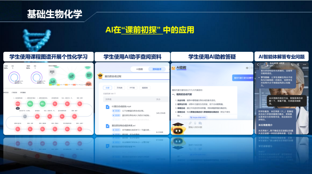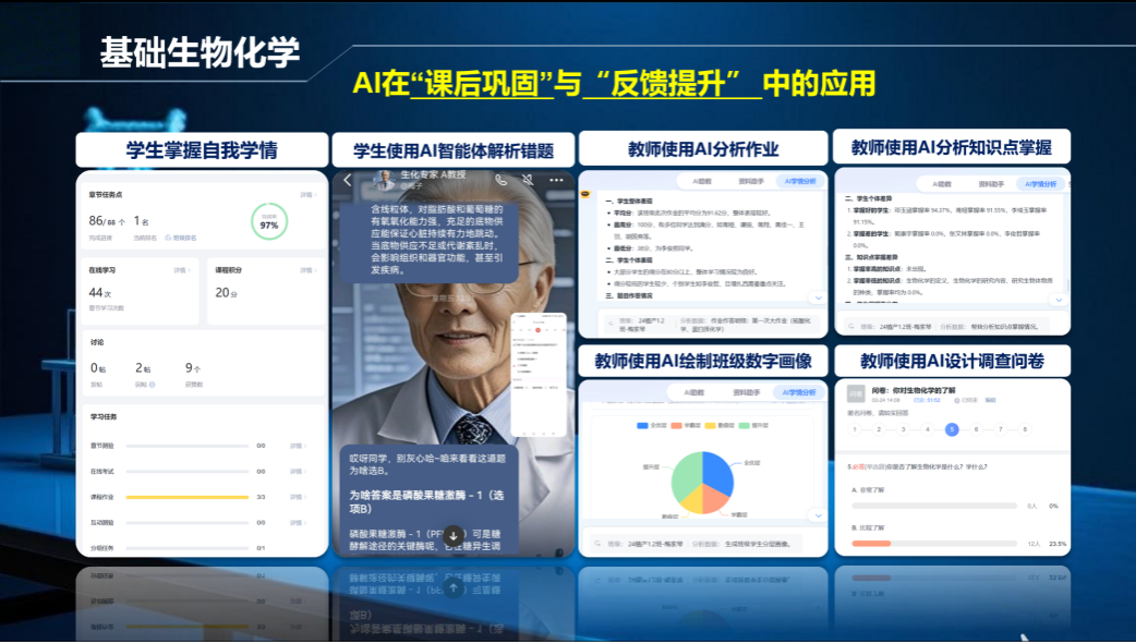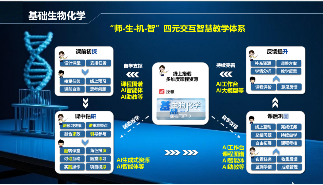 这门通识课的顺利运行,让我初尝数字化教学的甜头。如果说植物资源学是无心插柳的单点突破,那么从2022年末加入基础生物化学这门专业核心课并主导其数字化改革,则是真正“蓄意而为”的系统推进,而这也成为了我教学成长的“加速度”。作为面向十余个专业、近二十个教学班级的大课,改革之初挑战巨大。但在学院一位老师“教学要早做规划”的点拨下,我们团队锚定目标,迅速构建起了“师-生-机-智”四元交互的智慧教学体系,其精髓在于“双向解放”:AI工具与知识图谱为学生规划个性化学习路径,充当“导航仪”;教学平台自动处理考勤、批改、计分等琐务,AI助教则快速诊断学情,成为我的“千里眼”。我从繁琐事务中抽身,将节省出的时间用于更有价值的深度研讨与启发式互动。