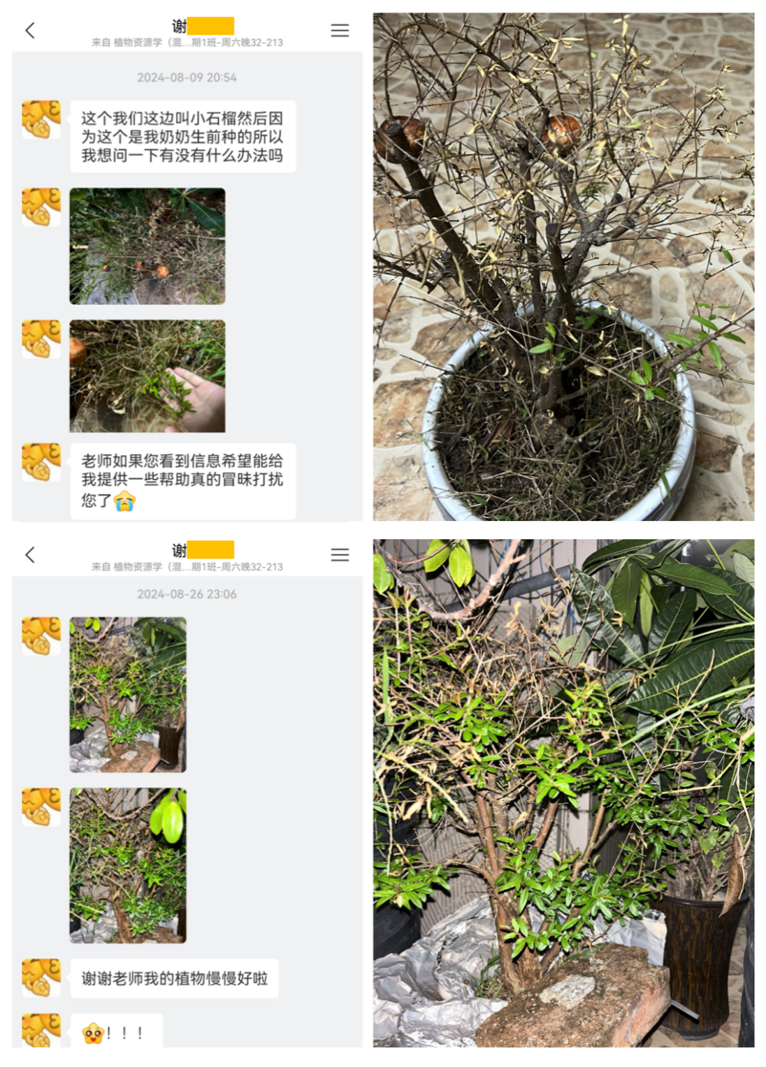 其中,一位学生的故事最让我记忆深刻。她曾焦急地向我求助,希望能救活一盆承载着对奶奶思念的、濒临枯死的石榴盆栽,我瞬间充满了使命感,全力以赴帮助她。半个多月后,学生主动发来了石榴恢复生机的照片,那一刻的喜悦与感动,远非任何绩效指标可以衡量。正是这点点滴滴的联结与回应,让我真切体会到“教学相长”的深度与温暖,让我对教学的态度,从一份“必须完成的任务”,转变为一项“真心热爱的事业”。