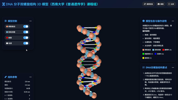 遗传学的核心难点在于许多概念无法直观感受,比如DNA分子的双螺旋结构、染色体的动态行为等。我利用AI工具开发了一系列可旋转、可拆解、可交互的3D模型、动画及虚拟实验,将抽象内容转化为可视、可感的实际体验,极大降低了学生的认知门槛,提升了课堂效率。对于摩尔根果蝇实验等经典内容,我也通过AI技术还原历史实验场景,让学生“走进”实验室,加深对科学发现过程的理解。同时,为延伸教学时空、适应学生碎片化学习需求,我还开发了一款以轻松有趣的方式为学生提供24小时在线的知识支持的AI智能学习助手——“精通遗传学的哪吒”,借助热门动画IP的亲和力,让知识交流变得更贴近学生、更有温度。