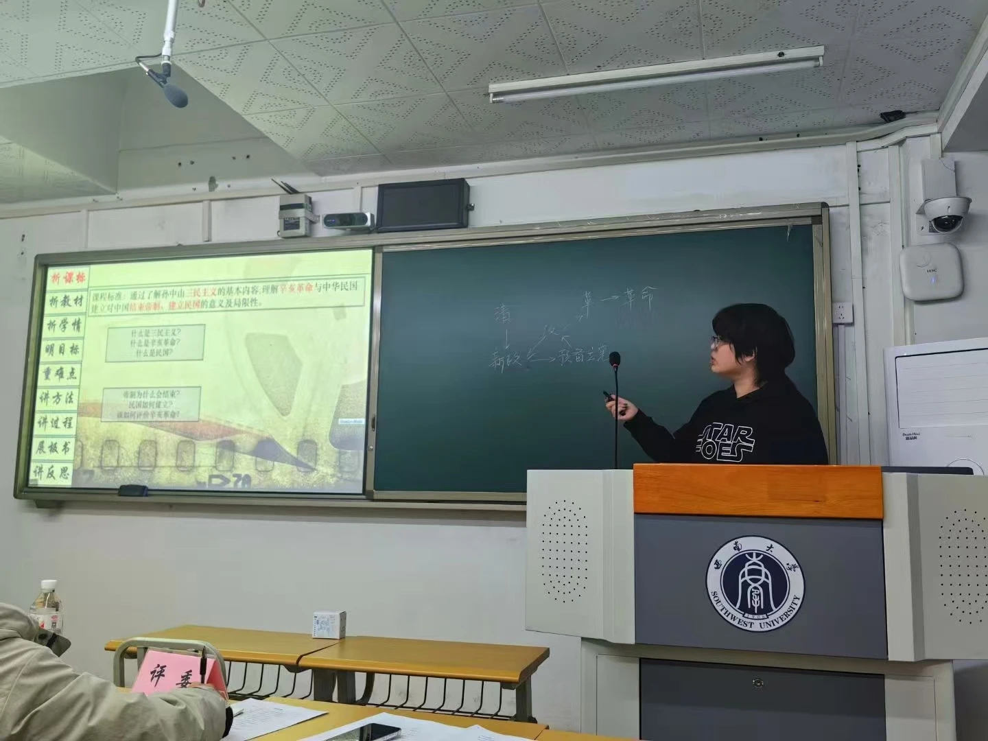 12月14日上午,说课讲课在第九教学楼分成16组同时进行。每位学生自选部编高中历史教材中的一个子目,依次进行5分钟的说课和12分钟的讲课展示。学院专业教师担任评委,进行现场点评指导并给出评分。既充分肯定了同学们的课堂设计创意与应变能力,也针对普遍存在的节奏把握、内容准确性、互动设计等共性问题提出改进建议,为师范生的后续成长指明了方向。
