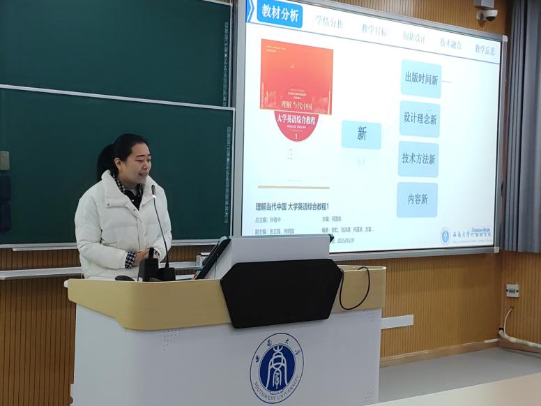 2025年12月19日,西南大学外国语学院成功举办首届大学外语教师教学创新大赛。本次大赛以“技术赋能、思政融入、模式创新”为主题,旨在搭建大学外语教学经验交流平台,促进教学模式创新,助力教师教学能力与育人水平双向提升。来自各教研室的八位教师进行了一场融合前沿教育理念与生动教学实践的专业教学展示。
